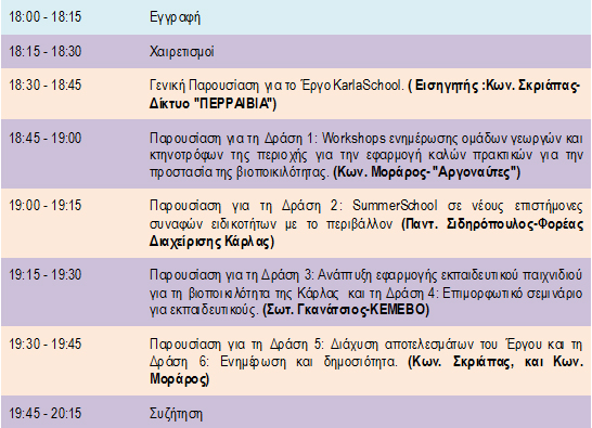 Οι Φορείς υλοποίησης του καινοτόμου και πρωτοπόρου Προγράμματος “KarlaSchool“ ,που έχει ως στόχο την ενημέρωση, εκπαίδευση και κατάρτιση νέων επιστημόνων, αγροτών και εκπαιδευτικών για τη προστασία και διατήρηση της βιοποικιλότητας της παρακάρλιας Περιοχής αλλά και την ανάδειξή της ως τόπου Οικοτουριστικής Ανάπτυξης,